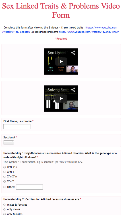 At the beginning of each section, the standard is quoted and the questions specifically aligned to that standard follow. I denote mandatory questions in blue highlighting. Once students complete the mandatory problems, they are free to answer or not answer the other problems. Not all students require the same amount of practice for each standard. In addition, this builds in extra practice for those who choose not to complete the entire problem set the first time around. The mandatory questions usually point out special scenarios that students may encounter. For example, on the chi square inheritance problem set, one of the mandatory questions demonstrated what would happen if expected numbers were zero. Since the chi square formula has the expected number in a denominator of a fraction, any problem with expected as zero would be undefined; it's important to have this scenario as a mandatory problem because many students are tempted to incorrectly give this answer as zero.